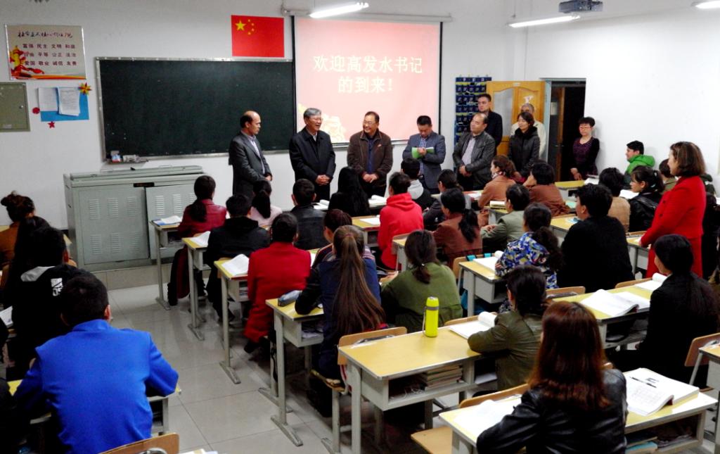 在2015级1班,同学们用幻灯打出了“欢迎高发水书记到来!”的字样。看到高发水书记来到同学们身边,大家兴奋地鼓掌欢迎,和高书记握手、问好。高发水同大家亲切交谈,了解同学们的学习、生活情况,并关切地询问同学们在北校区学习生活得是否习惯,有什么要求和意见可以向校领导提。