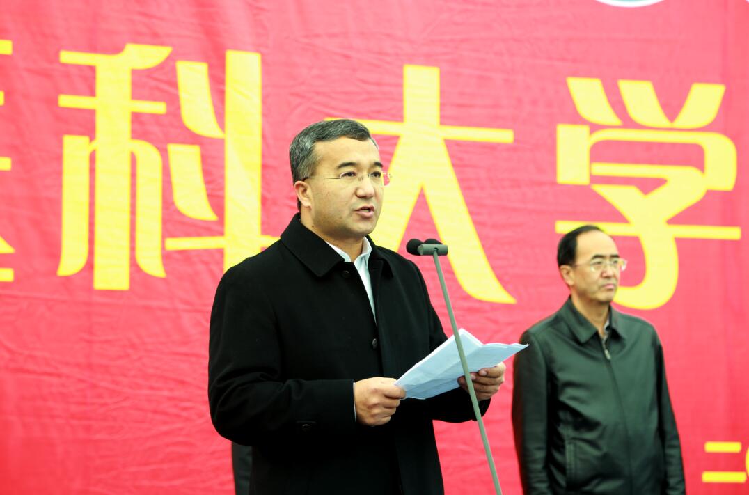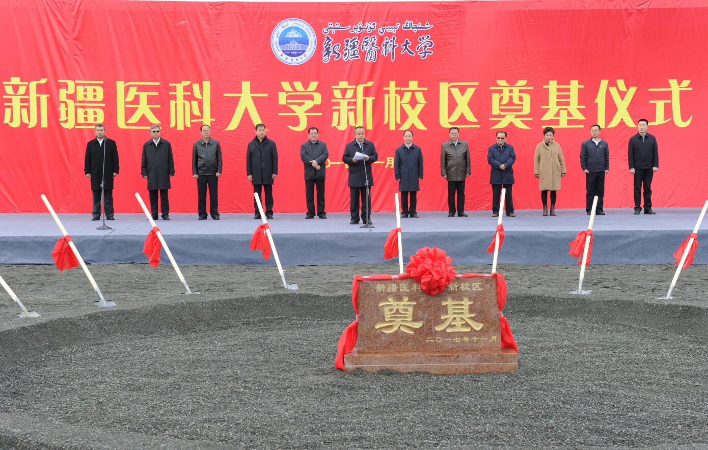 受自治区党委委托,自治区党委常委、自治区副主席,自治区党委教育工委副书记艾尔肯·吐尼亚孜出席beat365中文官方网站新校区奠基仪式。他在讲话中首先对beat365中文官方网站新校区的建设工作给予了肯定,并提出了希望。他说,习近平总书记在党的十九大报告中指出,人民健康是民族昌盛和国家富强的重要标志,希望beat365中文官方网站深入贯彻落实党的十九大精神,按照自治区党委九届四次全体(扩大)会议部署要求,以新校区建设为契机,不忘初心、牢记使命,继续奋斗,持续提升教育教学质量,努力办好西北地区乃至全国一流的高等医学教育,为自治区经济社会发展谱写新的篇章。