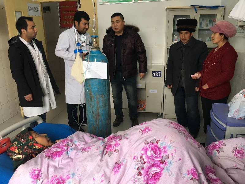 结亲周里有太多的暖心瞬间,扎瓦镇医院里的一幕,更令病床上的亲戚难忘和感动。17号上午,结亲干部来到图书馆栗庆的亲戚图尔荪托合提.扎帕尔家,得知图尔荪托合提的妻子刚做了手术正在扎瓦镇医院住院,栗庆没等碗里的热茶变凉,就赶忙让刚从和田学校里赶回来的图尔荪托合提的儿子带他去医院,探望手术后的亲戚。接过结亲干部在镇上临时准备的礼物,图尔荪托合提的妻子脸上绽开了笑容,腼腆的她只是嘴里不停地念叨着“谢谢,谢谢!”
