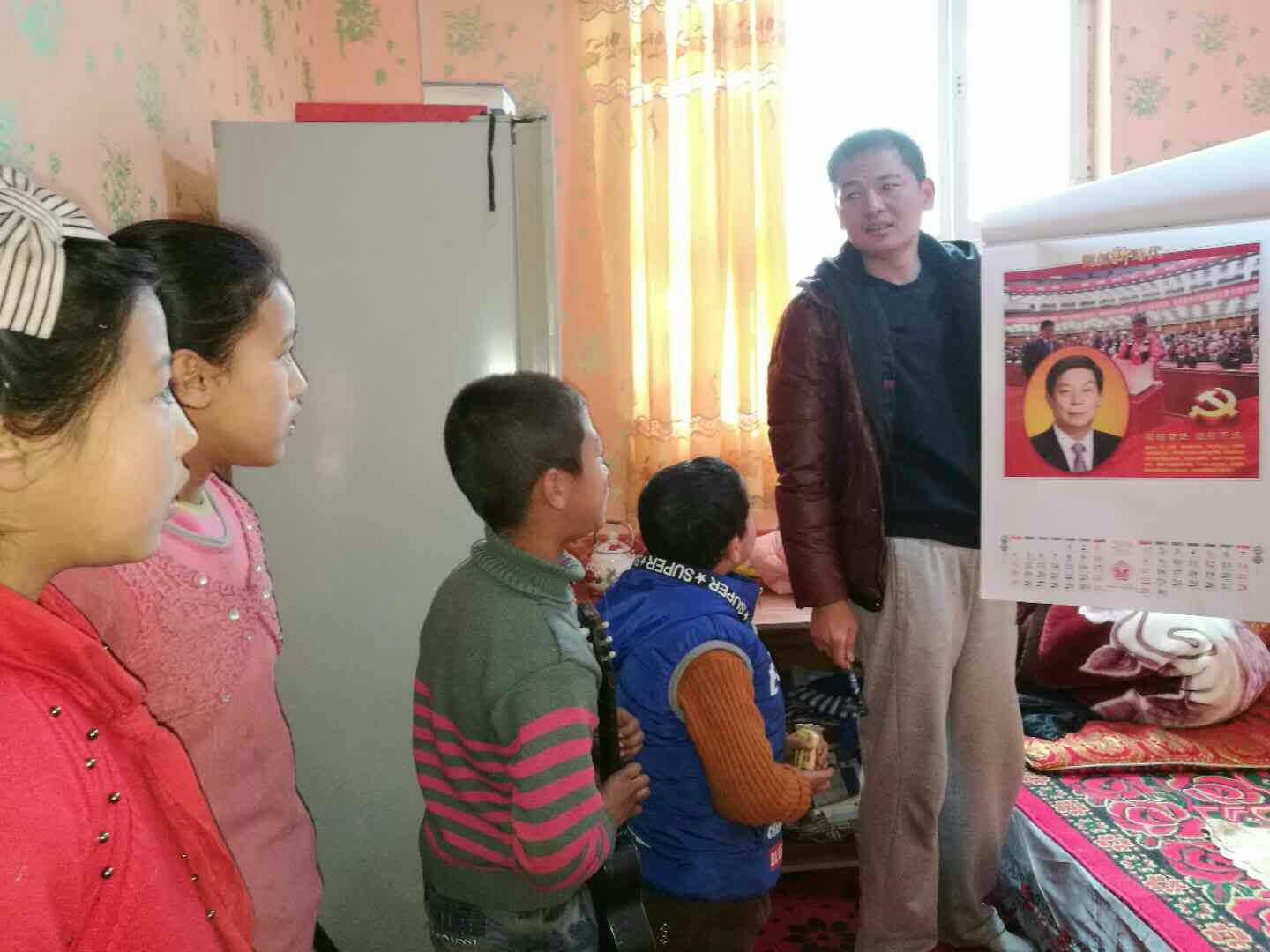 在这个温暖的大家庭里,结亲干部们与吐热汉大妈和她的曾孙女们一同围坐在炕上,结亲干部汤婷拿出带来的玩具,陈实给小姑娘带上送给她的毛绒耳套,房富利宣讲着党的十九大精神,夏热甫古丽激情的在翻译,小姑娘开心得玩着玩具,吐热汉大妈微笑着,用不太熟练的汉语不停地重复:“不忘初心,不忘初心……。”