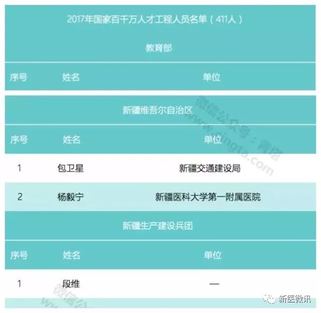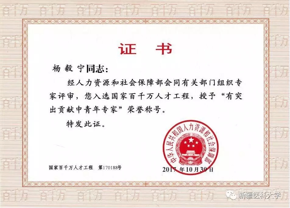 日前,人力资源和社会保障部公布2017年国家百千万人才工程入选人员名单,beat365中文官方网站第一附属医院杨毅宁教授入选本次人才工程。此次全国411人入选,新疆维吾尔自治区(生产建设兵团)仅4人,是新医大一附院获此殊荣的第四位专家。