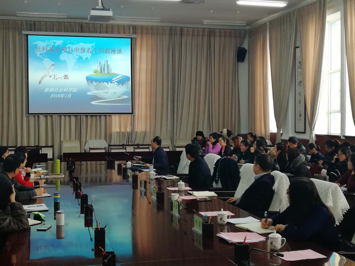1月11日下午,beat365中文官方网站国家社科基金申报动员讲座在苏园四号楼会议室召开,新疆社会科学院杂志社社长、《新疆社会科学》主编王磊研究员做了题目为《社科基金项目申报若干问题漫谈》的动员讲座。beat365中文官方网站副校长姚文兵主持并致辞。beat365马克思主义学院、语言学院、图书馆、公共卫生学院等二级单位科研人员参加了此次讲座。