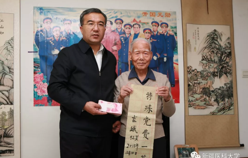 今年92岁高龄的吉斌老人是一名老八路、老党员。虽然年事已高,但老人家依然身体硬朗、思维清晰,平时爱好书法。见到凯赛尔校长一行来到家里慰问,还送来了慰问金,吉斌老人由衷感谢党和政府的亲切关怀,老人随即拿出了一沓早已包好的一万元现金,郑重地交到凯赛尔·阿不都克热木校长的手里,说:“这是我的特殊党费,请您一定要替我交给党组织,以表达我一个普通老党员的责任。”接过老人递上的一万元现金,听着老人朴实而恳切的话语,凯赛尔校长深受感动:“您的高风亮节真的让我们深受教育。我一定会把您的这份特殊的党费交给组织。我也代表组织衷心感谢您,您为我们所有党员干部们树立了很好的榜样,我们要学习您一生坚定跟党走的决心和一颗红心献祖国的赤诚之心。”
