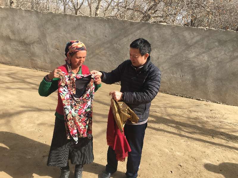 吕书勒将精心准备的一件新大衣、一件体恤和两条裤子,新手提包送给亲戚手中。热心地指导亲戚家的孩子学习写日记,养成良好的学习习惯和书写姿势。阿力木·吾斯曼得知曾经共同生活、共同战斗的老战友和谐村的阿不都吉里力因工摔伤后,立即带领大家去村委会看望,并送上了美好的祝福。