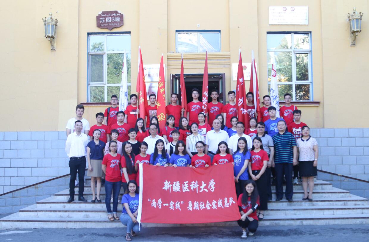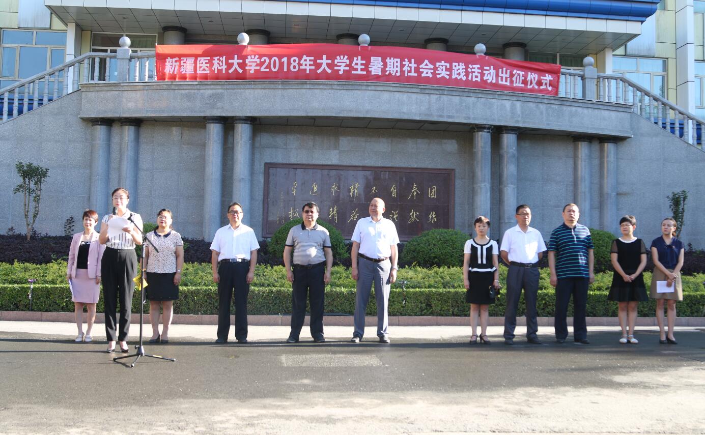 参加出征仪式的领导为实践队代表新疆学子百村行beat365中文官方网站2018年大学生暑期社会实践总队、beat365中文官方网站“两学一实践”暑期社会实践、beat365中文官方网站第四届“互联网+”大学生创新创业大赛青年红色筑梦之旅、beat365中文官方网站红领巾小课堂队旗和beat365中文官方网站自治区第十九期青马班学员助力“访惠聚”社会实践专项活动五支代表队授旗。校级总队、院级分队共同挥舞旗帜,实践队员精神抖擞,现场气氛热烈。