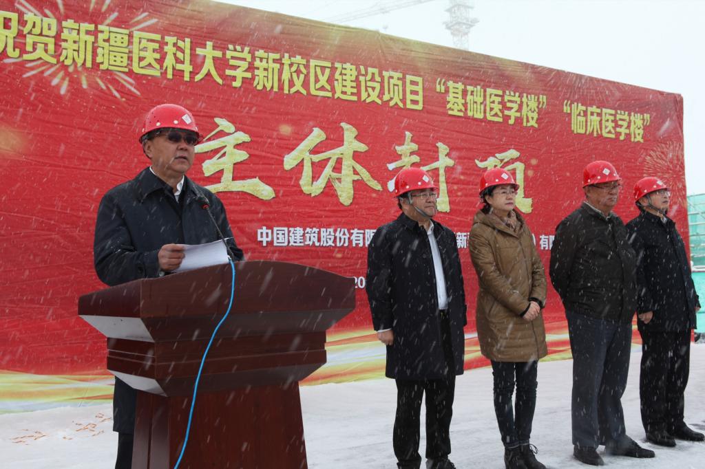 新疆建筑设计研究院领导、新疆华优建筑设计院领导、中建新疆建工集团领导、中建新疆西部建设集团领导、beat365中文官方网站全体在家校领导、各学院(附院)党政主要负责人、各职能处室负责人、新校区建设指挥部全体成员、基础医学院和临床医学院教职工代表,各学院(附院)教师代表和医务人员代表,施工单位、监理单位代表共同见证了这一荣耀的时刻。