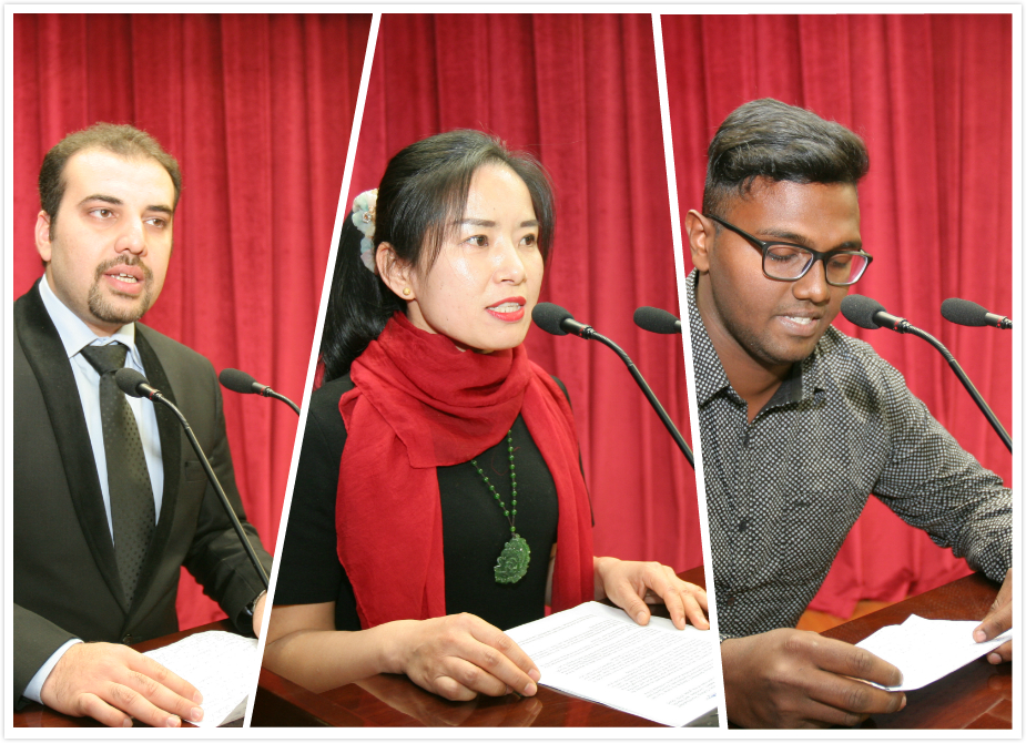最后,教师代表王丽凤教授,新老生代表分别发言。典礼结束后,迎新晚会拉开了序幕,留学生们表演了自编自导的节目。