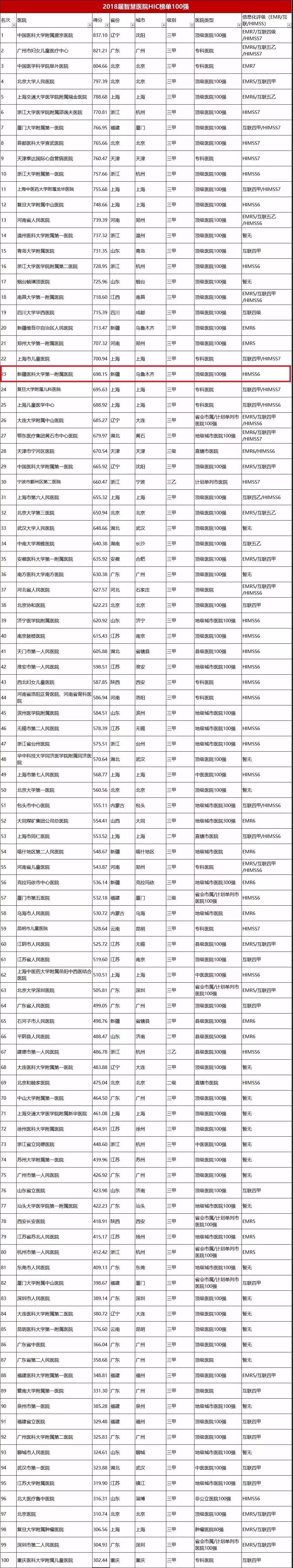 在《2018智慧医院HIC榜单100强排行榜》名单中,beat365中文官方网站第一附属医院是新疆首家通过了 HIMSS EMRAM 6级评审的公立医院,位居第23位。