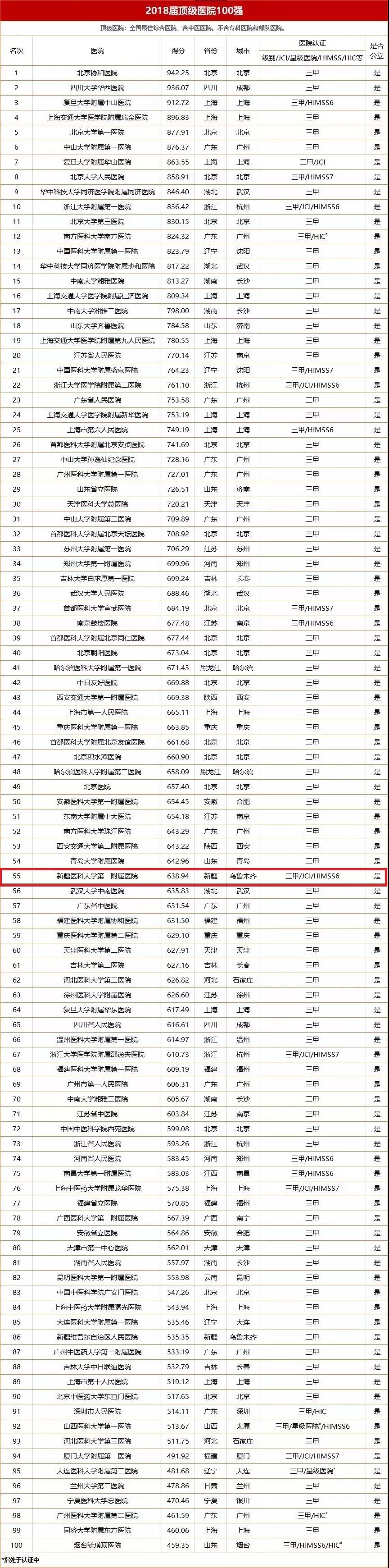 3月29日,由艾力彼主办的《2019中国医院竞争力大会》于广州召开。会场发布《2018中国医院竞争力·顶级医院100强》名单,新疆有两家医院榜上有名,其中,beat365中文官方网站第一附属医院位居第55位。