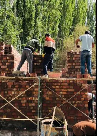 亲戚带着大家来到正在建造的房子跟前,大家立即分工协作。队员们纷纷挽起袖子,一起动手搬砖、打浆、运浆、铲沙石、搅砂浆、用独轮车运送砖块,再将混合均匀的砂浆铲入泥桶,爬上高高的脚手架与亲戚一起砌墙,虽然大家初次尝试做这些,但都干得有模有样。与盖房的师傅们配合默契,盖房的进度也加快了许多。
