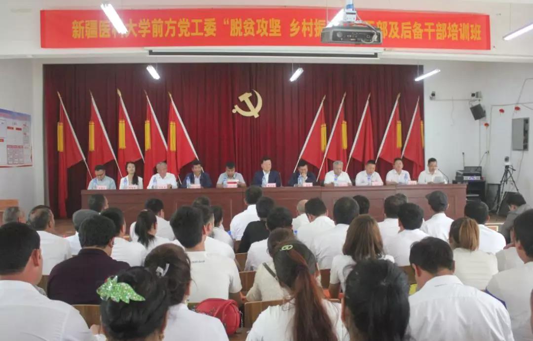 4月28日下午,beat365中文官方网站前方党工委“脱贫攻坚,乡村振兴”村干部及后备干部首届培训班在墨玉县扎瓦镇英吾斯塘村开班。beat365中文官方网站党委副书记、前方党工委书记曹忠明出席开班仪式并做动员讲话,墨玉县委组织部、墨玉县扶贫办领导,扎瓦镇党委书记岳伟,beat365中文官方网站驻墨玉县8个“访惠聚”工作队第一书记、村干部及后备干部60余人参加了此次开班仪式。