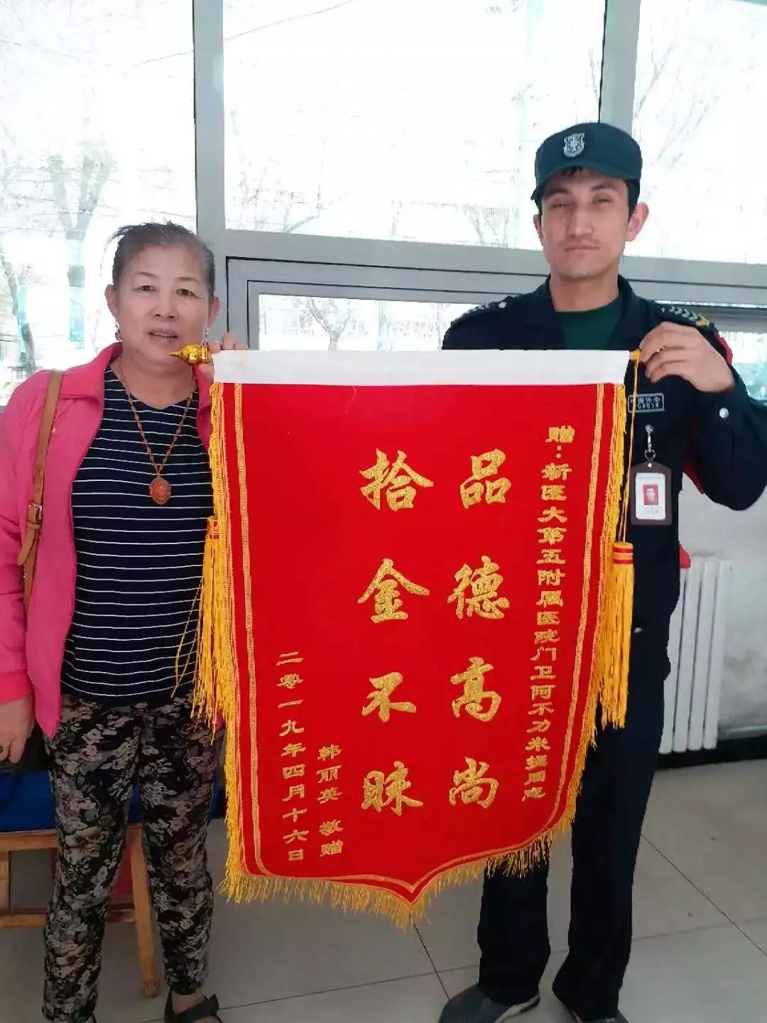 时间过去了一会儿,失主韩丽英着急地找到住院二部,额头上已有了密密的汗珠,她当天本是来医院看望住院的朋友,没想到走出医院不久,一掏口袋钱包不见了,钥匙丢了进不了家门,身份证丢了补办需要周期,还有才取的近千元现金,韩丽英越想越慌,绕了一圈,从医院后门进来,想去调监控,没想到在监控里看到阿卜力米提·阿卜都合力力正拿着钱包往监控室走,试图调监控寻找失主。4月16日,韩丽英送来了锦旗以表感激,也结识了这位淳朴、善良的大兄弟。