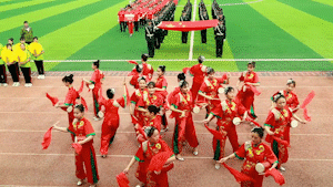 下午3点30分,伴随着“运动员进行曲”,和着音乐的节拍,国旗仪仗队迈着整齐而坚定的步伐,托举着鲜艳的五星红旗缓缓通过主席台,正式拉开了运动会入场式的序幕。在国旗的引领下,红旗方阵、附属中学鼓号队方阵,以及各学院运动员方阵依次入场。主席台和看台上的观众全体起立向各个方阵表示敬意、鼓掌加油。