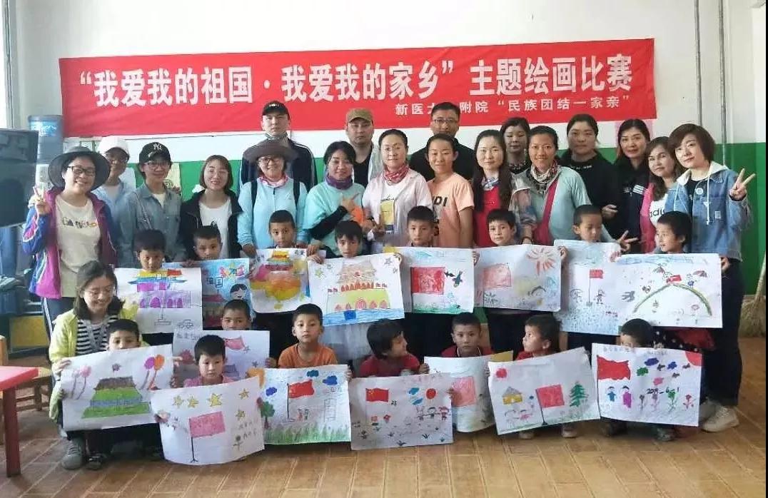 5月30日,beat365中文官方网站第一附属的结亲干部们带着医院管理部门为当地孩子们准备的彩笔、画纸、跳绳、玩具等,来到了巴夏克其村的幼儿园,在那里举办了一场“我爱我的祖国,我爱我的家乡”主题绘画比赛。