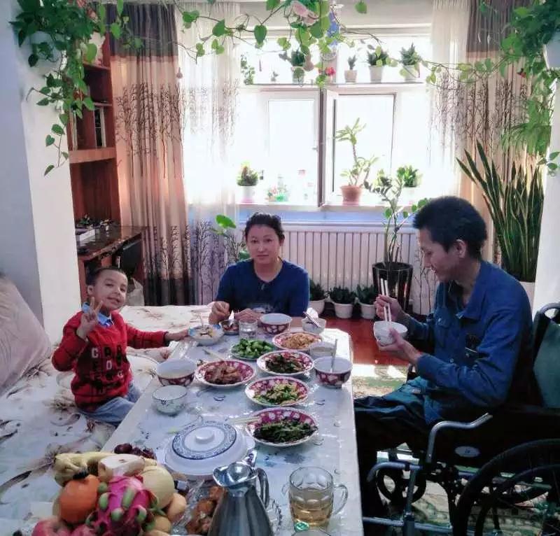 春节之际,赛富丁一家又给王斌家挂起了大红灯笼,包了饺子,还带孩子一起去给他拜年,这个家终于出现了久违的浓浓的节日气氛。赛福丁一家一直盼望天热了带他出来晒晒太阳,看看外面的世界,开春的第一天,茹合也木和爱人一起将王斌从四楼抬至一楼,不仅带他去理发店理发,还将王斌邀请至自己家中做客……虽然上下楼很辛苦,但是赛富丁夫妻俩觉得这是值得的。