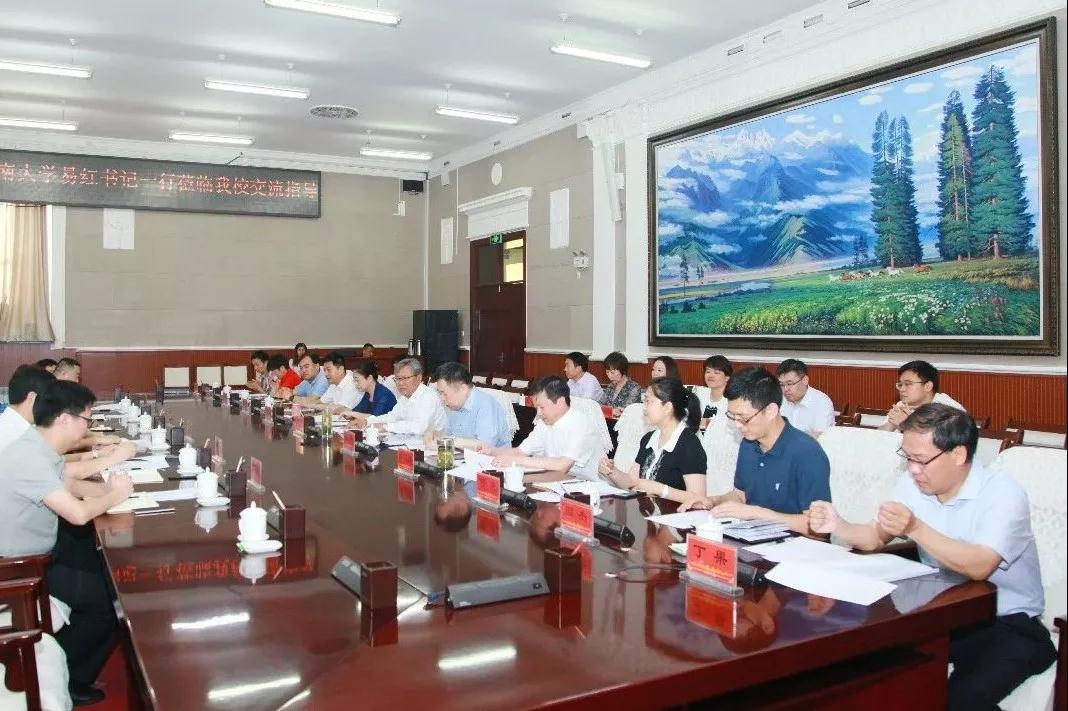 6月25日上午,中南大学党委书记易红教授一行来到beat365中文官方网站,与beat365就进一步开展对口支援工作进行座谈交流,并看望慰问援疆干部。校党委书记高发水,校领导姚文兵、赵翠芳、李豫凯和相关职能处室、学院负责人,以及中南大学援疆干部人才、对口支援干部等参加了座谈会。