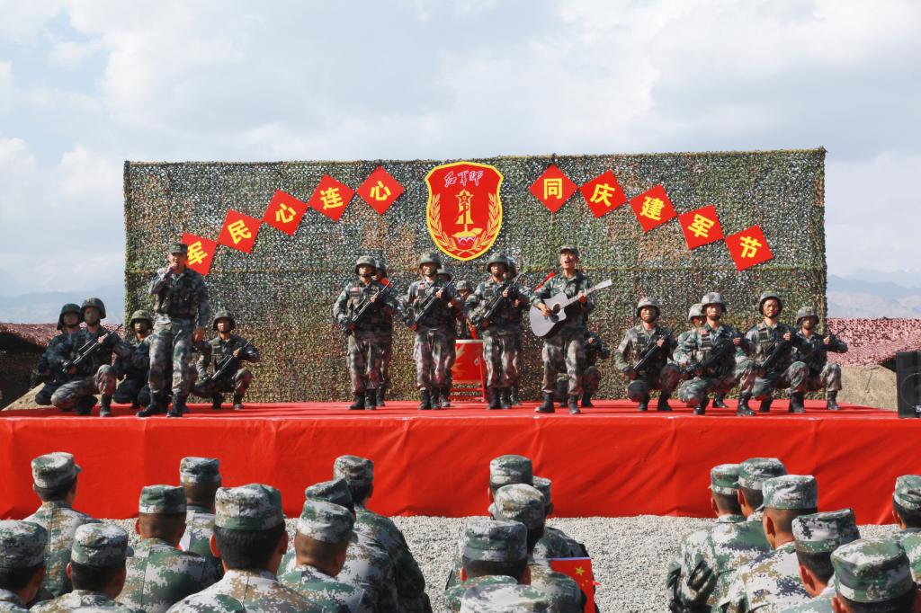 官兵们演出的旗舞《精忠报国》、歌伴舞《兄弟一条命》、小品《蜕变》和独唱《绿色军衣》,表达了中国军人的爱国忠诚、敢于担当、勇于奉献的优秀品质,展现了职业军人把青春热血投入保家卫国、守护人民的伟大事业中。
