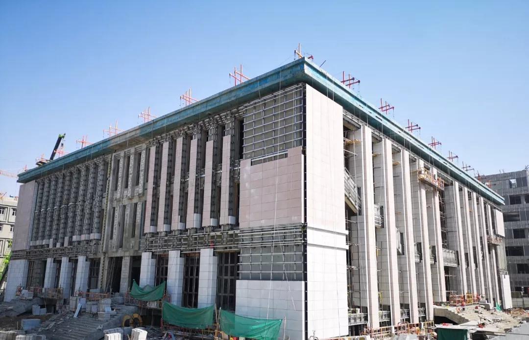 从雪莲山顶俯瞰这片繁忙而充满生机的建设工地,首先映入眼帘的是校区内最大的单体建筑——主教学楼。外墙干挂石材已完成90%的主教学楼犹如穿上了气派的“新衣”,两侧连廊串接起的基础医学楼和临床医学楼的外装也已经完成,楼前中心广场和教学楼前的大理石台阶铺装进入了收尾阶段,三栋楼宇成“品”字形摆开,显得气势宏伟。