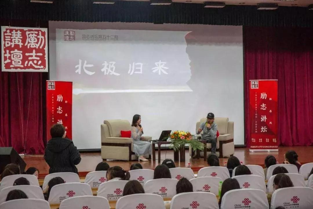 在嘉宾介绍视频结束后,学生们迫不及待想看到这位抵达梦想彼岸的人,“大家知道中国有一条河流入北冰洋吗?”精神抖擞的侯志立老师开场问到,“因为这条河的存在,北冰洋有了中国的温度。”在访谈环节,主持人问侯志立老师是如何埋下梦想的种子,侯志立老师幽默地说,我吹了个要漂到额河尽头的牛。选择了去实现梦想,去沿额河一路向北。