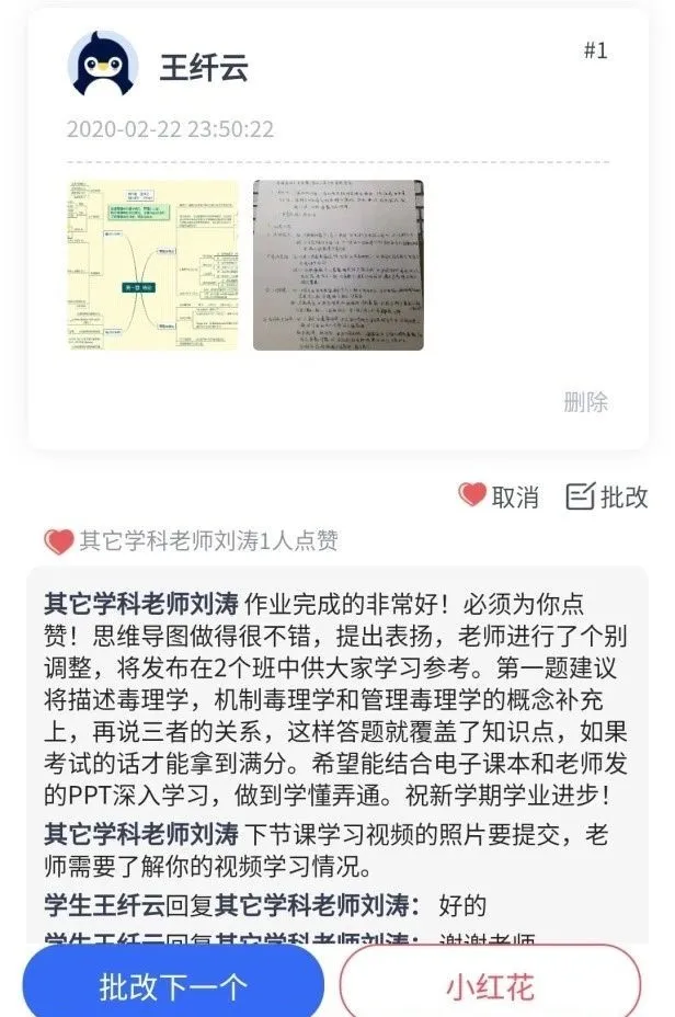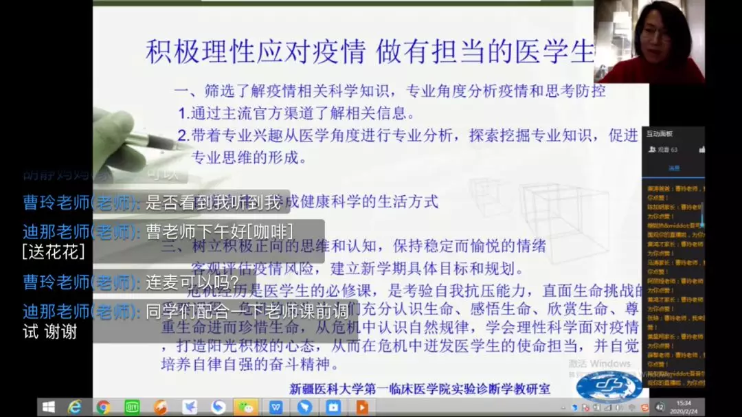 同时,教师们还围绕当前疫情防控战役中,广大医护人员勇敢逆向前行、展现医者的崇高使命和家国情怀的内容,将爱国主义、职业道德教育融入了在线课堂。老师们条理清晰、娓娓道来,学生们认真思考、积极互动,在线课堂秩序井然、气氛热烈。