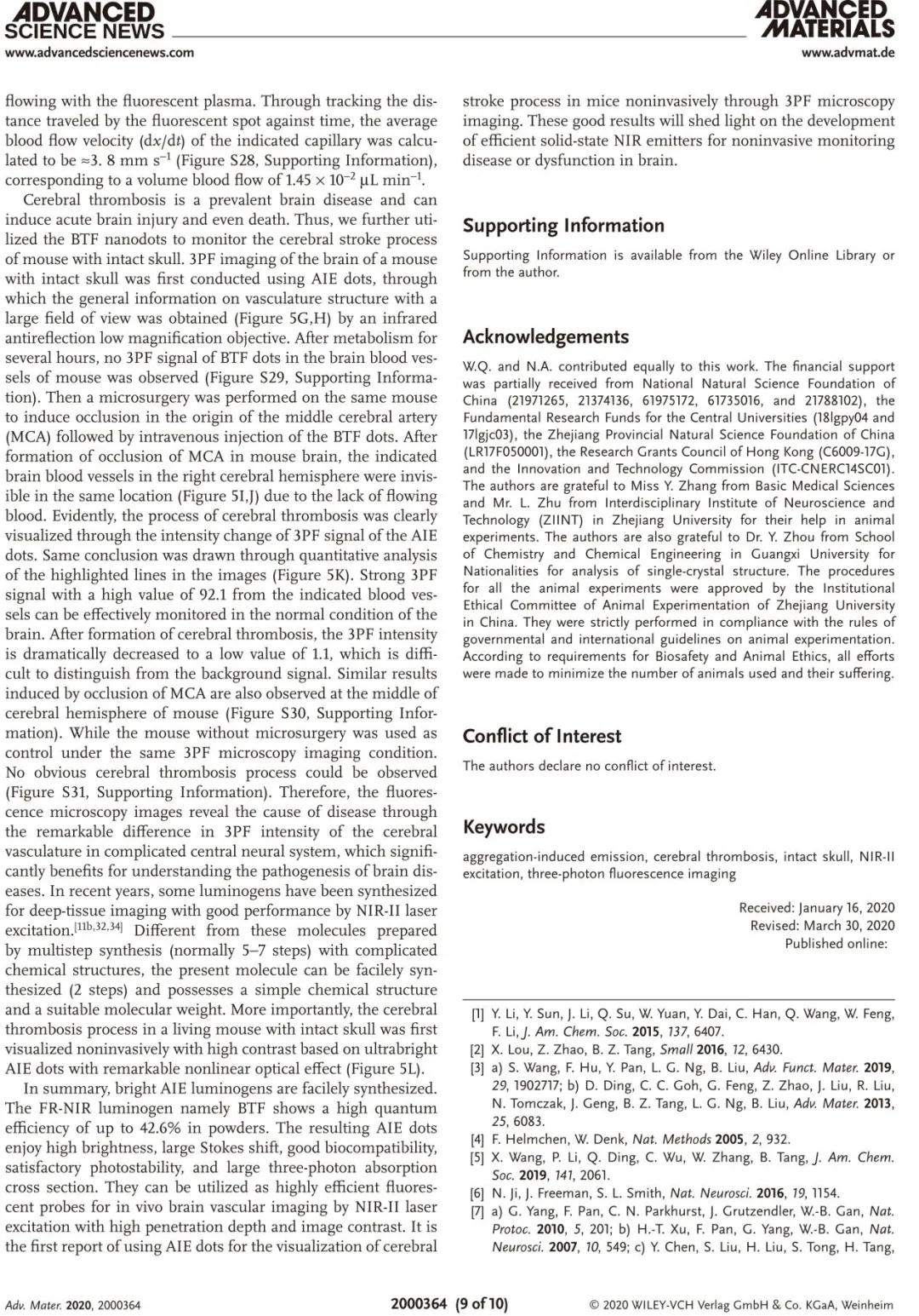 在此之前的5月1日,努尔尼沙·阿力甫博士与浙江大学钱骏教授研究团队及香港科技大学唐本忠院士研究团队、中山大学梁国栋副教授合作,作为共同第一作者在《Advanced Materials》上发表了题为“Facile Synthesis of Efficient Luminogens with AIE Features for Three‐Photon Fluorescence Imaging of the Brain through the Intact Skull”的文章,报道了他们在3PF成像有机染料方面的进展。利用具有高亮度、大Stokes位移、良好的生物相容性、良好的光稳定性和大的三光子吸收截面的AIE纳米材料作为一种有效的荧光纳米探针,通过三光子荧光显微成像技术对完整的颅骨进行活体脑血管成像。这是首次使用AIE点通过完整小鼠颅骨来可视化脑卒中过程的例子,且具有高穿透深度和良好图像对比度。《Advanced Materials》为国际材料科学领域权威期刊,其2020年最新影响因子IF=27.398。