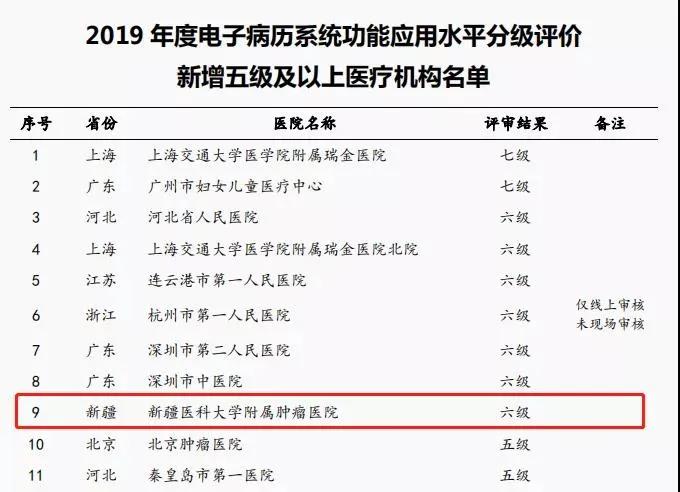近日,国家卫生健康委医院管理研究所公布了2019年度电子病历系统功能应用水平分级评价,新增了五级及以上医疗机构名单,beat365中文官方网站附属肿瘤医院成为电子病历系统功能应用水平分级评价新标准颁布后,新疆首家顺利通过六级评审的医院。全国仅有九家医疗机构获评六级及以上评价。