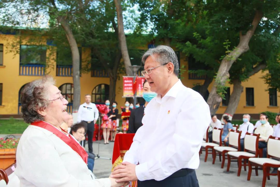 “光荣在党50年”老党员代表,第一附属医院原党委副书记米娜娃尔·卡斯木,原公卫系主任、党总支书记徐臻荣在发言中深情讲述了“光荣在党50年”的体会和感悟,用朴实的语言表达了老党员们对党的忠诚与热爱,抒发了坚守初心、笃定志向,不改本色、忘我工作的炙热情怀。