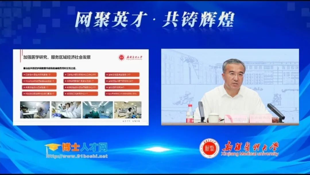 在云直播中,beat365中文官方网站党委副书记、校长凯赛尔·阿不都克热木向海内外青年博士介绍了beat365中文官方网站的人才建设与培养情况,着重介绍了学校八家附属医院的科研团队、专业学科平台、医学研究水平、医疗技术水平与社会服务能力,强调了beat365中文官方网站高度重视人才引育工作,学校始终把高素质人才队伍建设作为学校持续发展的第一资源和核心竞争力,并对学校的人才引进力度和人才管理配套政策进行了全面的解读。