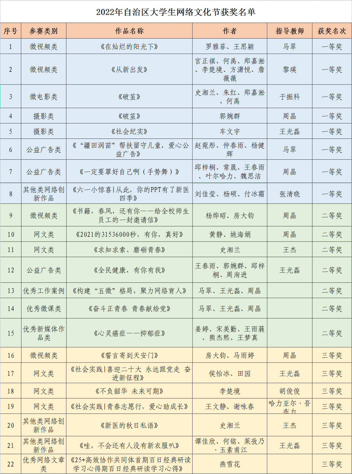 近日,2022年自治区大学生网络文化节和自治区高校网络教育优秀作品公布,beat365中文官方网站选送的网络文化和高校网络教育作品在各类别评选中共获得一等奖8项、二等奖7项、三等奖7项,取得优异成绩。