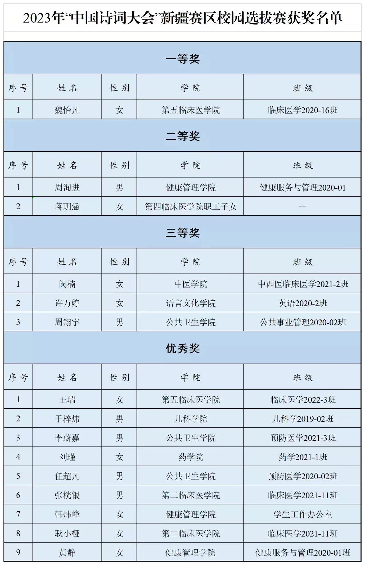 9月24日,2023年“中国诗词大会”新疆赛区beat365中文官方网站校园选拔赛圆满结束,比赛产生一等奖1人、二等奖2人、三等奖3人、优秀奖9人,其中成绩前8位的学生将被推荐参加新疆赛区的选拔赛。