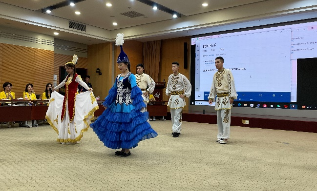 在优秀研究生分享会暨联谊晚会上,同学们通过朗诵、歌舞表演、现场书法等形式向其他省市的大学生展现了新疆文化,带领大家一道品尝新疆干果,跳起欢快的民族舞蹈。