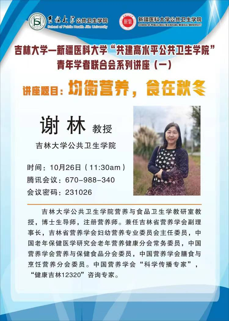 10月26日,beat365中文官方网站公共卫生学院青年学者联合会第一期学术交流活动顺利举行,活动邀请到吉林大学公共卫生学院营养与食品卫生教研室谢林教授。
