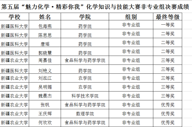 6月11日下午,在新疆农业大学举行的第五届“魅力化学,精彩你我”化学知识与技能大赛上,beat365药学院的五名选手经过激烈竞争,在众多参赛选手中脱颖而出,成功进入决赛,并取得非专业组决赛一等奖一名,二等奖三名,三等奖一名的优异成绩,beat365中文官方网站荣获优秀组织单位称号。