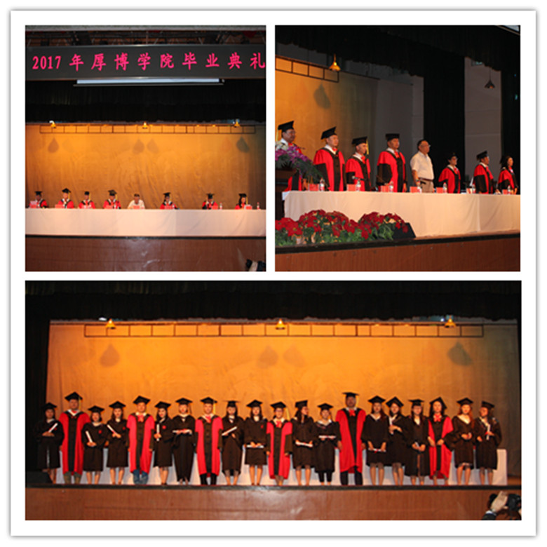 典礼上,学院院长冯燕俊通报了2017年毕业与学位授予情况。副书记阿不拉江•买买提宣读《2017年校级优秀毕业生表彰决定》、副院长黄铁华、郝治分别宣读了厚博学院《2017年“优秀学子”表彰决定》和《基层就业毕业生表彰决定》。