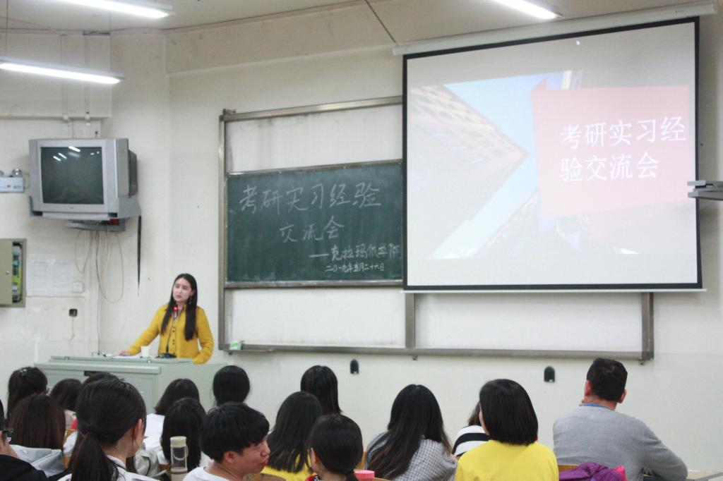 beat365中文官方网站克拉玛依学院北校区于5月26日晚开展了“分享•交流•进步”考研、实习经验交流会,邀请伊木让•哈米提、杜家虞、陈泰安等七位分别被beat365中文官方网站、苏州大学等四所院校录取的同学分享考研经验,肖星宇、依克热木•卡的尔等四名优秀实习生代表分享实习经验,助力北校区2015级临床医学学生们备战即将面临的考研和实习。