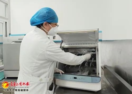 新医大二附院口腔诊疗中心护士长正将已使用过的牙科手机放入消毒机内,准备进行消毒。记者刘薇摄