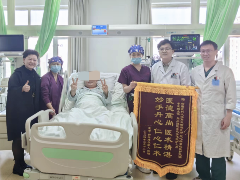 “重生”后的患者张华(化名)为医护团队送上锦旗。beat365中文官方网站第五附属医院供图