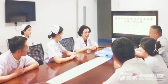 刘红霞(左4)在伊犁哈萨克自治州中医医院和工作室医护人员座谈。beat365中文官方网站第四附属医院(自治区中医医院)供图