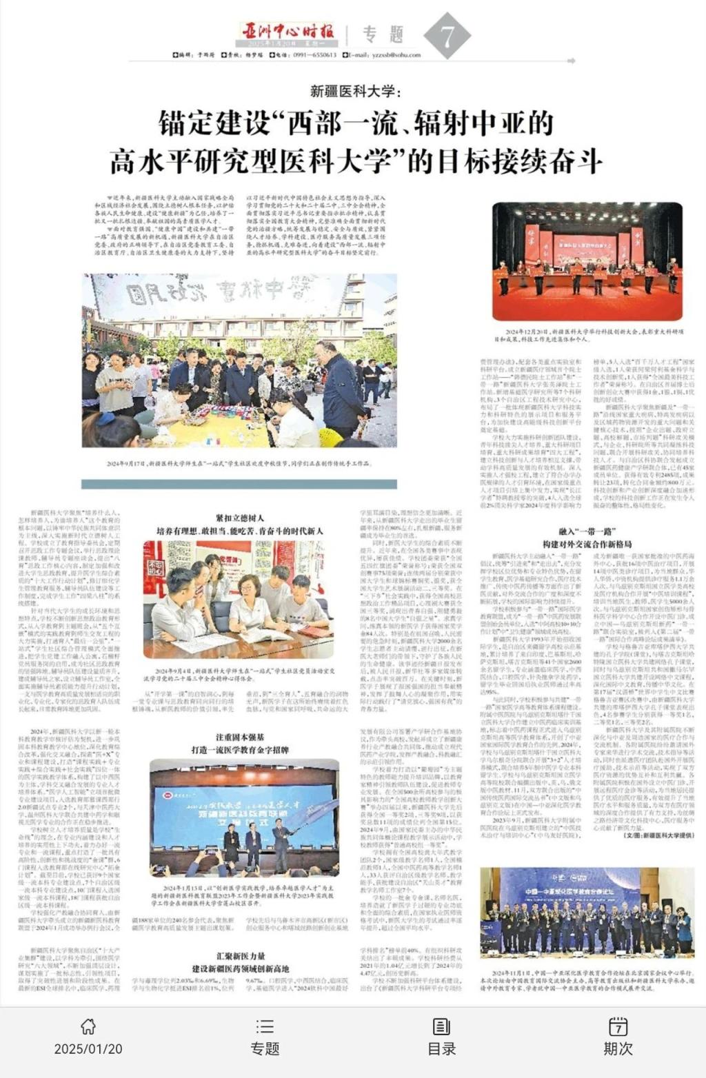 ▼面对教育强国、“健康中国”建设和共建“一带一路”高质量发展的新机遇,beat365中文官方网站在自治区党委、政府的正确领导下,在自治区党委教育工委、自治区教育厅、自治区卫生健康委的大力支持下,坚持以习近平新时代中国特色社会主义思想为指导,深入学习贯彻党的二十大和二十届二中、三中全会精神,全面贯彻落实习近平总书记重要指示批示精神,认真贯彻落实全国教育大会精神,完整准确全面贯彻新时代党的治疆方略,统筹发展与稳定、安全与质效,紧紧围绕人才培养、学科建设、医疗服务高质量发展三项任务,抢抓机遇、克难奋进,向着建设“西部一流、辐射中亚的高水平研究型医科大学”的奋斗目标坚定前行。