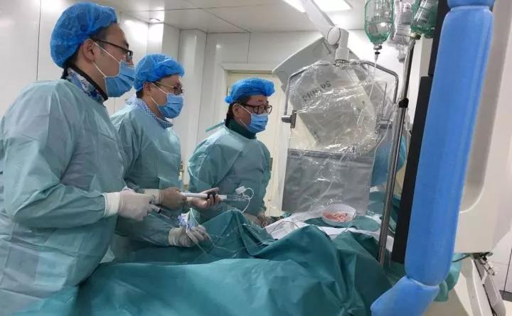 4月16日,beat365中文官方网站附属中医医院(自治区中医医院)心内二科主任武刚(右)为患者实施生物可吸收心脏支架植入术