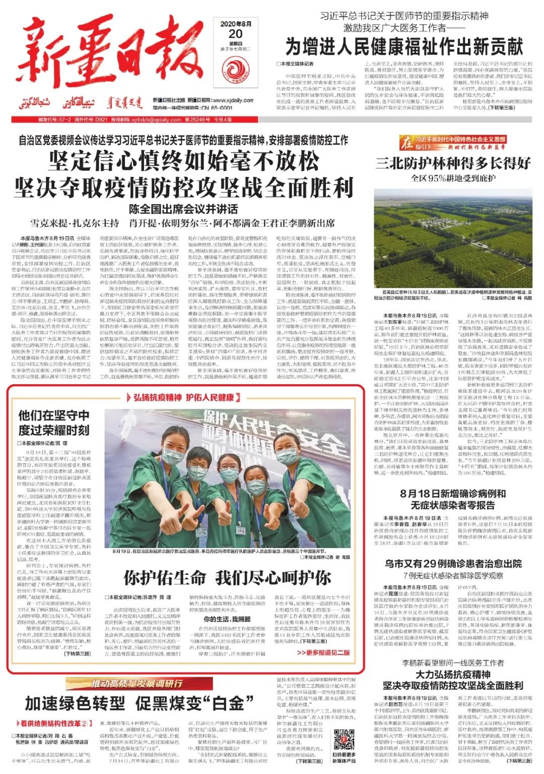 8月19日,第十二届“中国医师奖”颁奖典礼在北京举行,这个特殊的节日,本应在颁奖现场接受礼赞和掌声的其中3位获奖者杜斌、赵建平、杨毅宁,却坚守在自治区新冠肺炎医疗救治定点医院里救治患者。