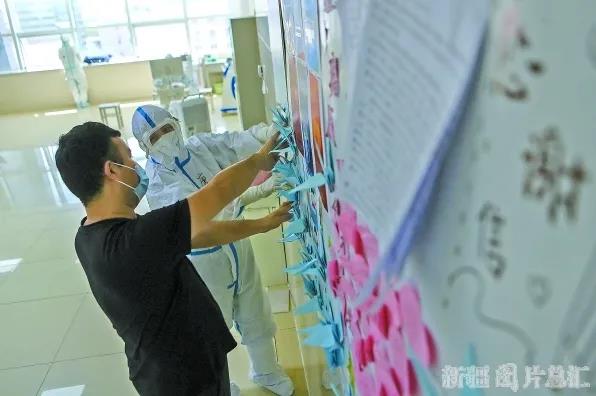 8月22日,在自治区新冠肺炎医疗救治定点医院4号楼9病区,一位患者在信息栏里张贴感谢信