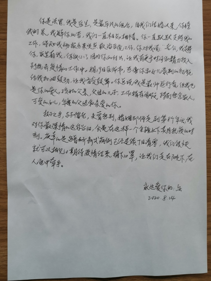 提到写信的初衷,赵兵说:“8月16日是我的生日,女儿手写了一份祝福,拍照给我。看到照片,我鼻子有些酸。所以我也想在这个特别的日子里,给妻子写一封信,疫情结束后,我会好好保存这封信,这里面有我和妻子、女儿最难忘的记忆。”