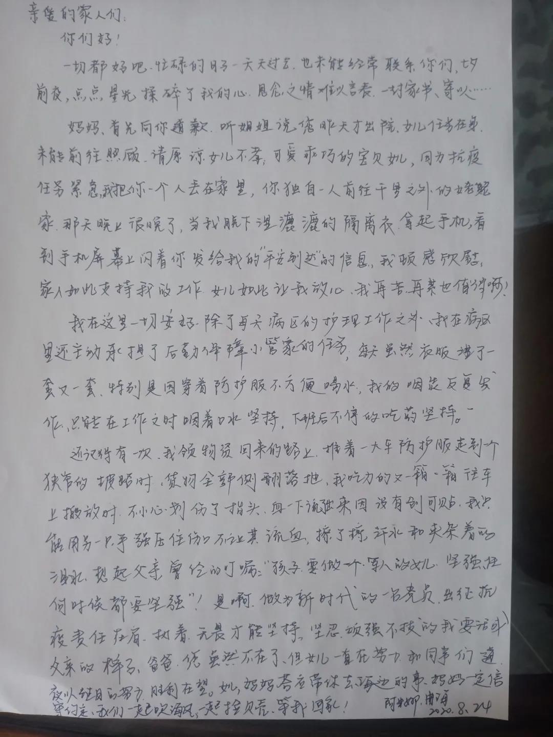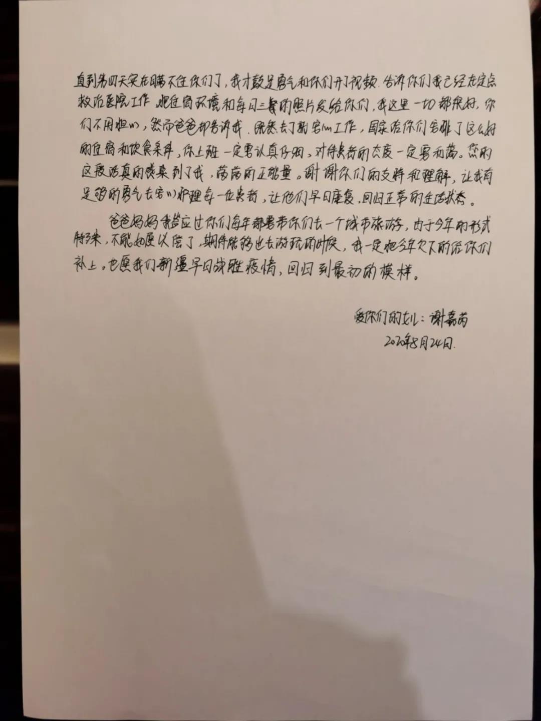 父母眼中的谢嘉芮还是一个长不大的孩子,对她很不放心。“我参加疫情防控工作也是事后才告诉父母的。我给他们写信,就是想告诉父母,工作虽然很累,但我把自己照顾得很好,请他们放心。”谢嘉芮说,“我希望在抗疫工作中,能扛起应该承担的责任!”