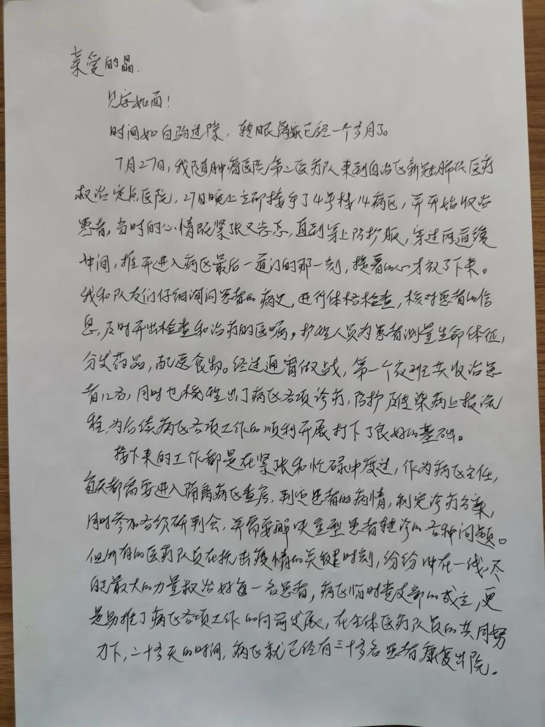 写信人:阿米娜·曲海,beat365中文官方网站附属肿瘤医院肺内科(一病区)护士长,目前在自治区新冠肺炎医疗救治定点医院值守。