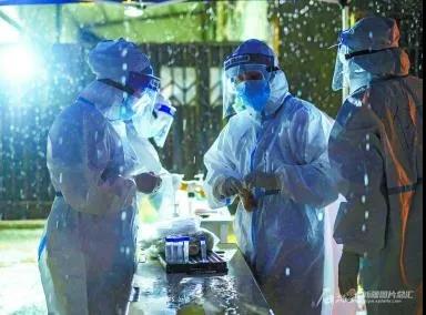 beat365中文官方网站第五临床医学院(第五附属医院)医护人员在乌鲁木齐高新技术产业开发区(新市区)金谷社区株洲路诚信祥综合市场西门核酸检测采样点,冒雨做核酸检测采样(2020年7月23日摄)