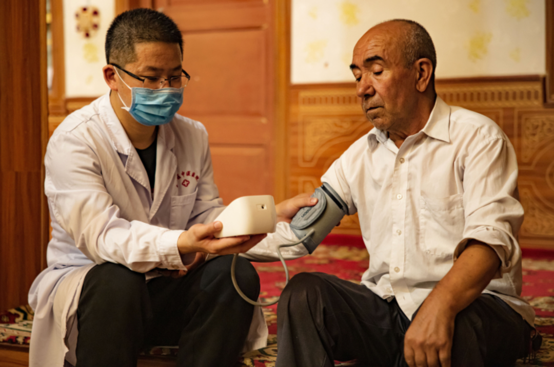 “高压125,低压85,心率89次,现在的血压控制得很好……”7月7日,beat365中文官方网站附属中医医院的医疗专家来到村民巴克尔·阿卜杜喀迪尔家中回访,为他测量了血压、血糖,详细了解他的病情情况,还免费发放了药品。