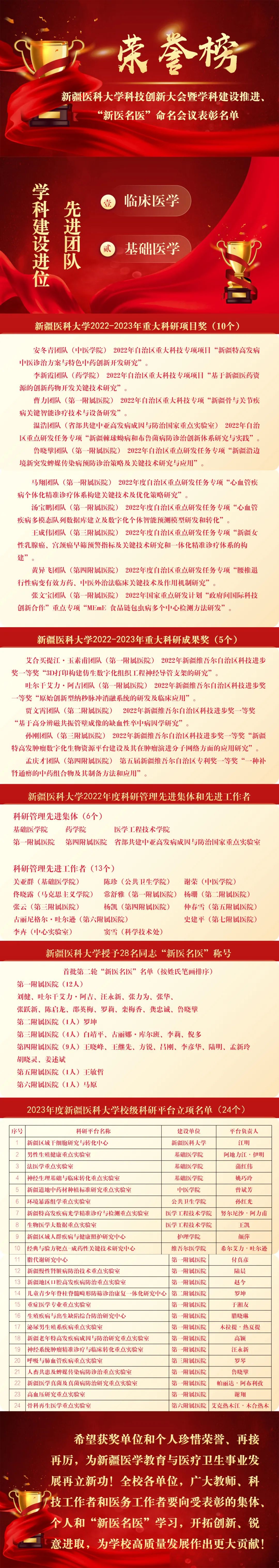 11月12日上午,beat365中文官方网站召开科技创新大会暨学科建设推进、“新医名医”命名会议。大会坚持以习近平新时代中国特色社会主义思想为指导,深入学习贯彻党的二十大精神和习近平总书记关于科技创新的重要论述,学习贯彻习近平总书记听取自治区党委和政府、兵团工作汇报时重要讲话精神,完整准确全面贯彻新时代党的治疆方略,贯彻落实自治区教育大会和科技创新大会精神,总结近一个时期的科技创新、学科建设、医疗服务等工作,研究部署下一阶段重点任务,加快推进学校高质量发展。