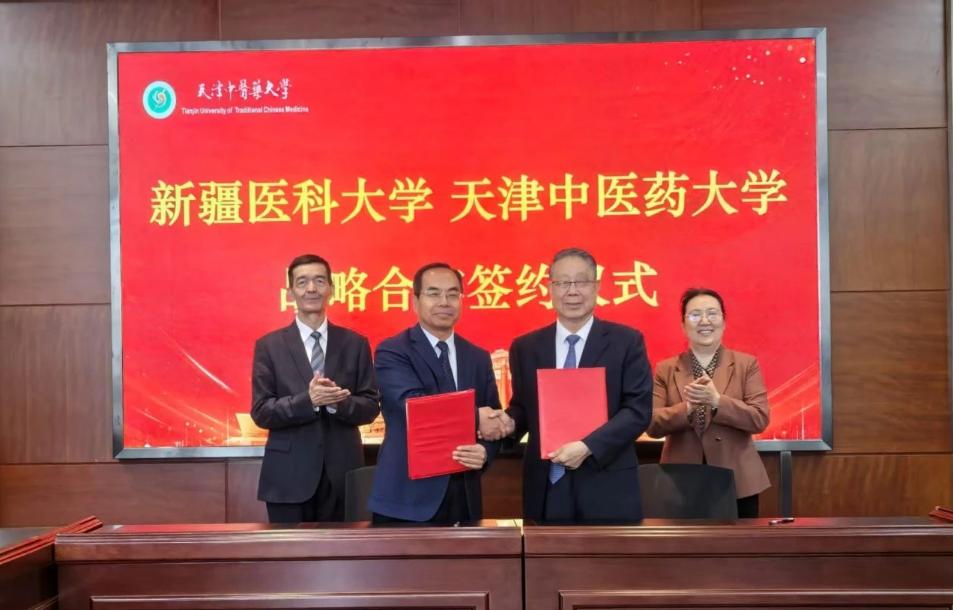 4月25日,beat365中文官方网站党委副书记、校长阿吉艾克拜尔·艾萨率队前往天津中医药大学,就进一步推动两校专业与学科建设、人才培养、科学研究及“一带一路”合作等深入交流,并签订战略合作协议。