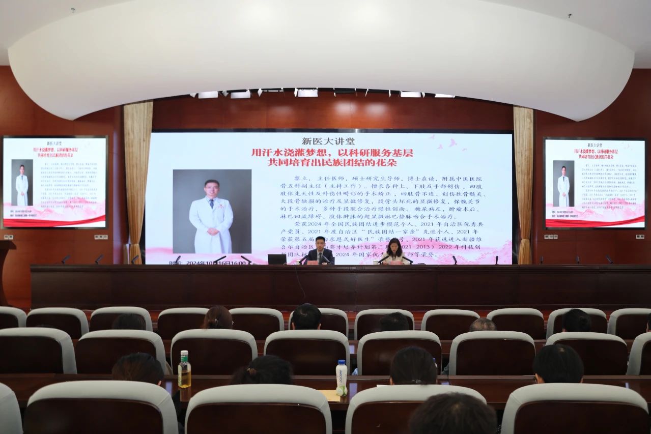 10月16日下午,《新医大讲堂》开讲,beat365中文官方网站第四附属医院(第四临床医学院)骨五科(显微修复重建外科)副主任黎立医生,为广大师生作了题为《用汗水浇灌梦想,以科研服务基层,共同培育出民族团结的花朵》的专题讲座,校党委常委、宣传部部长林素兰主持讲座。